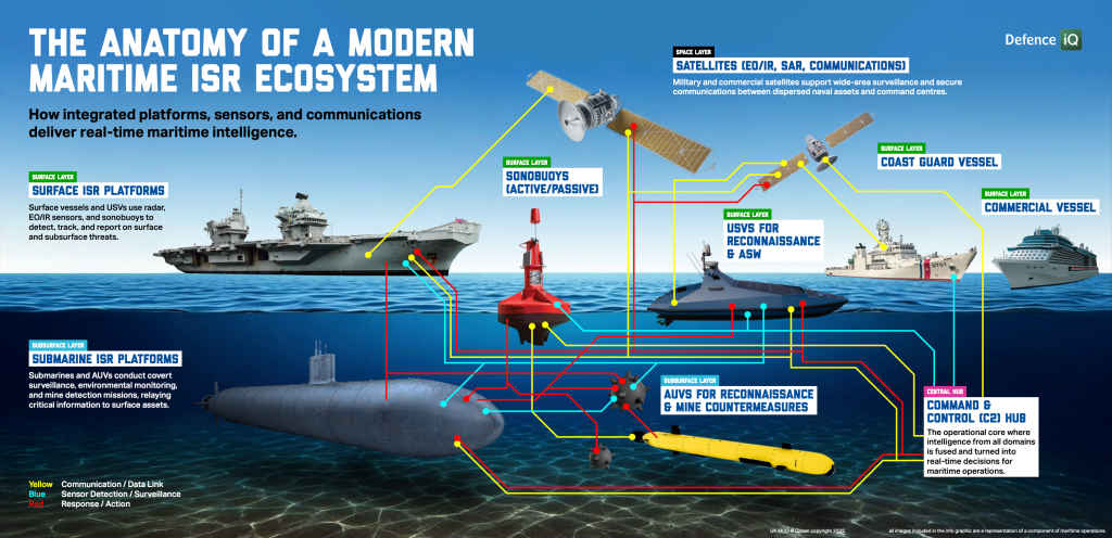 This infographic breaks down the anatomy of today�s maritime ISR ecosystem � showing how satellites, submarines, unmanned platforms, and advanced sensors are seamlessly connected through command hubs and data links